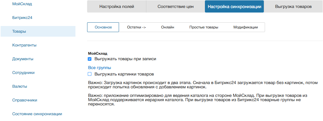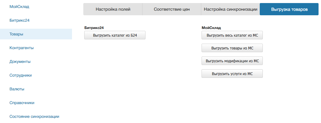 4. На текущий момент поддерживается обмен товарами, с учетом модификаций, и услугами. Вы можете выгрузить полный (или ограниченный) список товаров и услуг из МойСклад в Битрикс24 при начале запуска приложения.