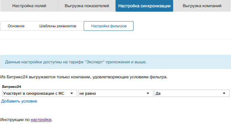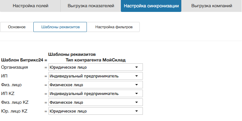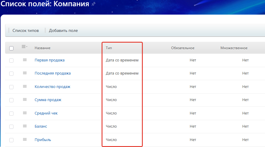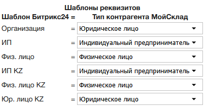 Важно: типы данных полей в Битрикс24 и МойСклад должны совпадать, иначе могут возникнуть ошибки при синхронизации.